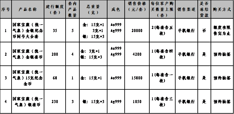 1.应有关要求,本次贵金属纪念币面向实名客户销售,国家宝藏(统一气象)金银纪念币同号大全套不限制客户星级,产品额度有限,售完即止。其余各规格采用“预约抽签”方式确定可购买的客户。本产品对应的每位客户购买数量上限等请见本公告第一条中“具体产品信息”内容。